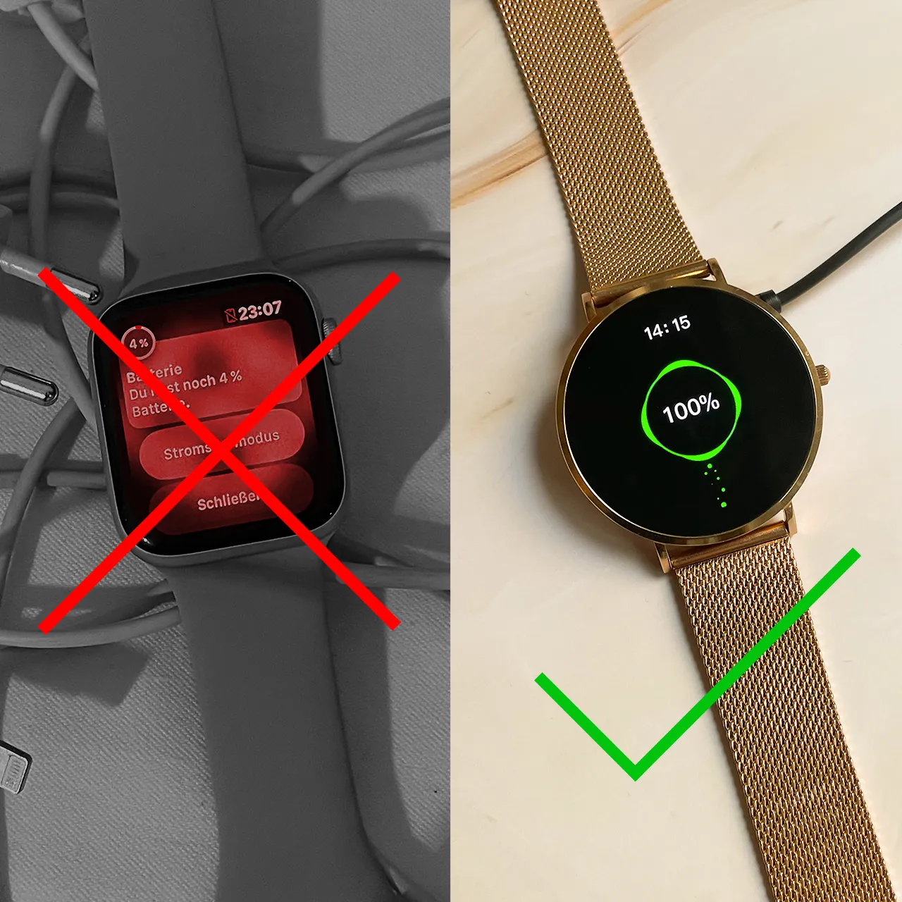 Ausgerechnet wenn du aus dem Haus willst ist der Akku leer? Das passiert mit anderen Smartwatches jeden Tag. Der Akku der California reicht für 5 Tage bei aktiver Nutzung. Im StandBy-Modus sind 15 Tage ohne Aufladung möglich. Musst du mal dringend los ist die California in 15 min für 2 Tage geladen!