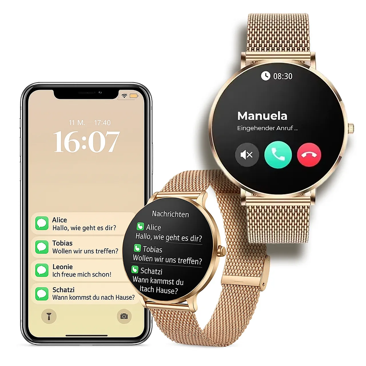 Ja! Du kannst Anrufe direkt an der California-Smartwatch annehmen, Textnachrichten anzeigen und Benachrichtigungen abrufen, ohne dein Smartphone aus der Tasche zu nehmen.