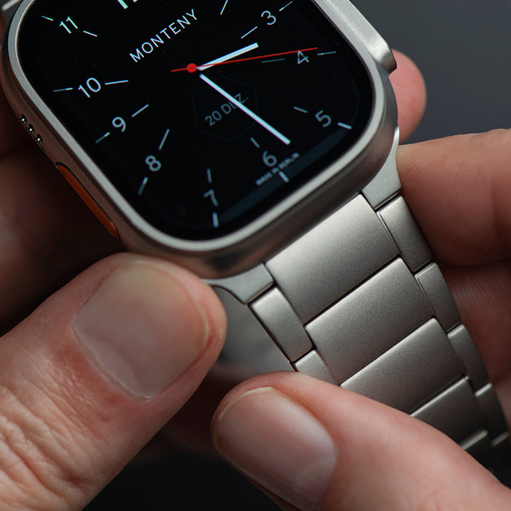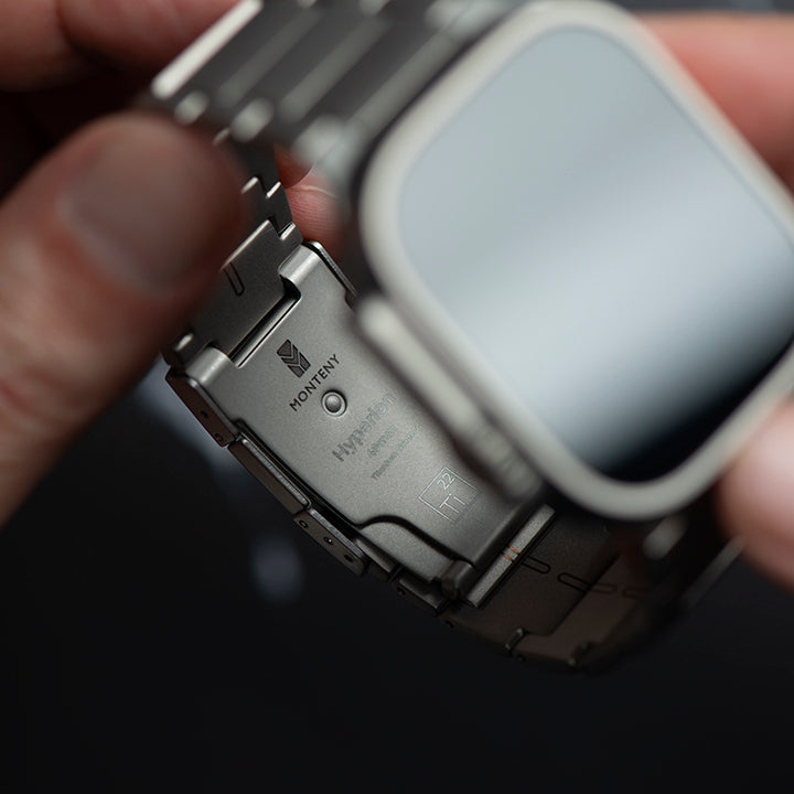 Das Hyperion Titan Armband für die Apple Watch Ultra von MONTENY bietet einen extrem hochwertigen Look, der perfekt zur Ultra passt. Es vereint Luxus und Funktionalität, um ein starkes Gefühl von Vollkommenheit zu vermitteln.