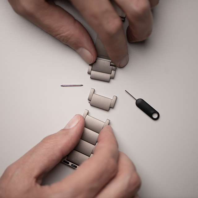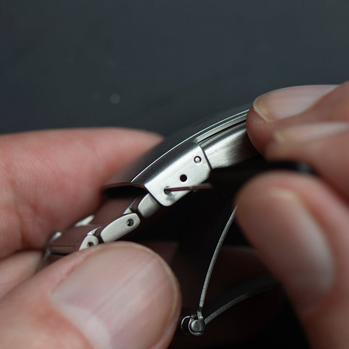 Das Hyperion Titan Armband wird mit einem Werkzeug zum Kürzen des Armbands geliefert. Du kannst mehrere Glieder mit ganzer Länge und zwei mit halber Länge entfernen. So kannst du es genau nach deiner Vorliebe einstellen und sofort benutzen, ohne zusätzliche Kosten für eine Anpassung beim Uhrmacher.