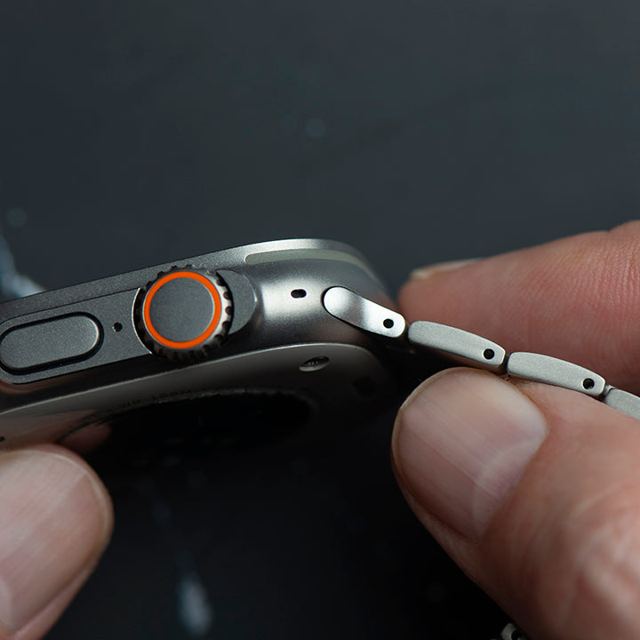 Das Hyperion Titan Armband für die Apple Watch Ultra verfügt über eine glasperlgestrahlte Oberfläche mit einer edlen, seidenmatten Textur. Dieses Finish verhindert Fingerabdrücke und sorgt für eine saubere und ästhetische Optik.